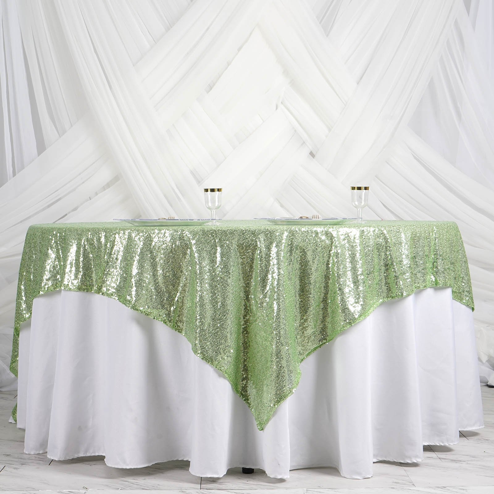 Buy 90" x 90" Tea Green Premium Sequin Square Overlay